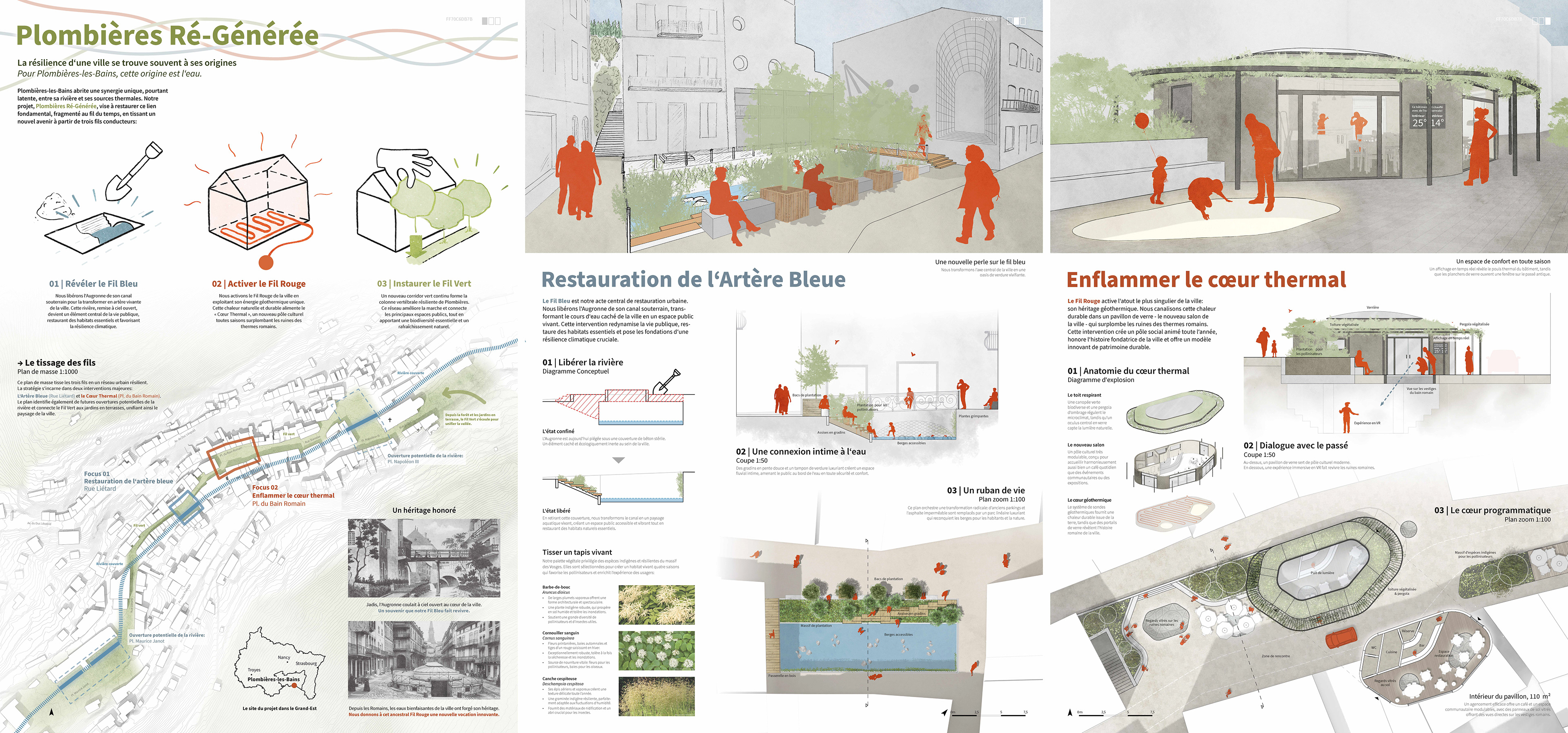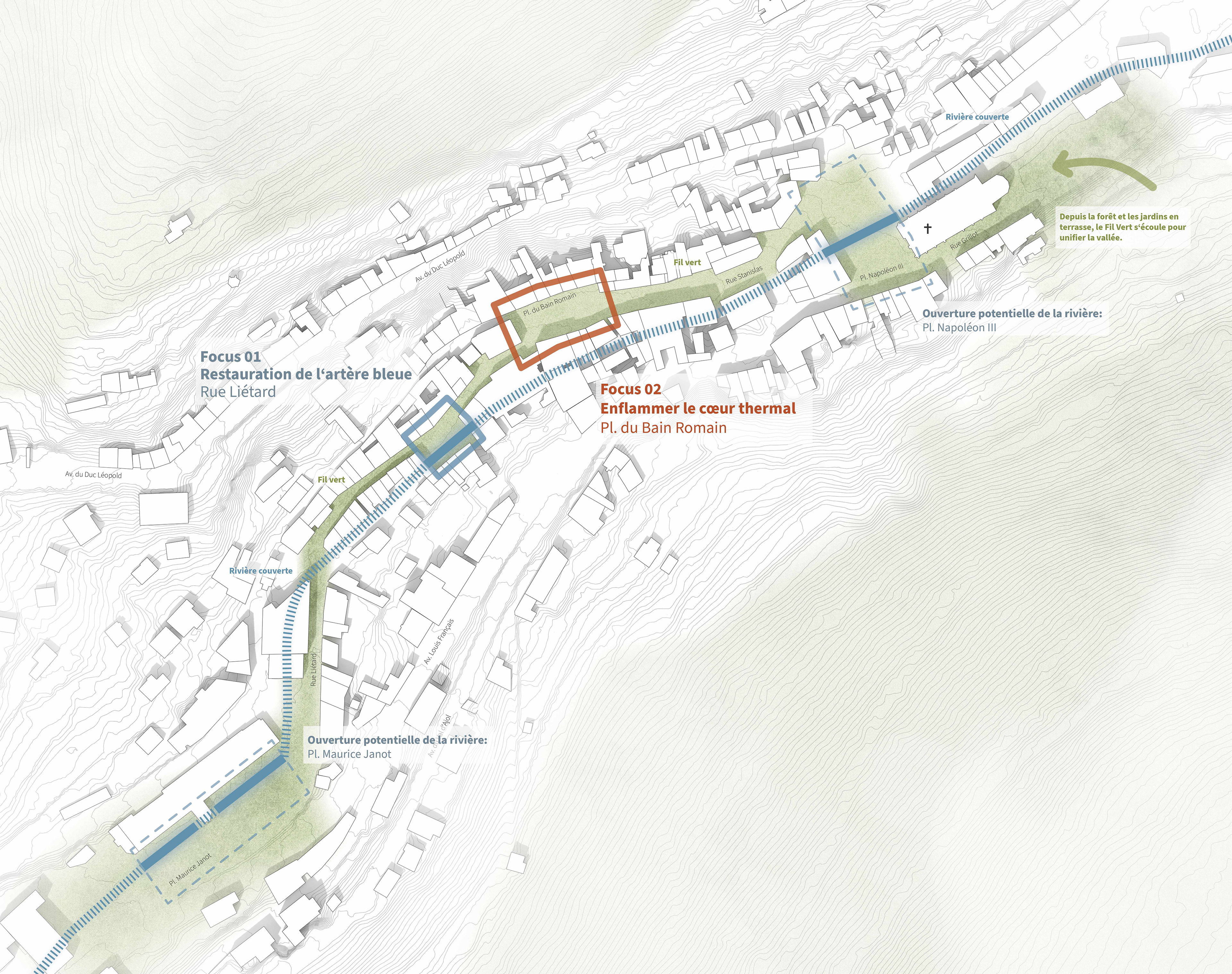 Plombières-les-Bains is a historic spa town defined by its hot and cold water sources, yet disconnected from it. Our competition entry, Plombières Ré-Générée, proposes weaving three "threads" together (Blue, Red & Green) to revitalize the urban fabric.