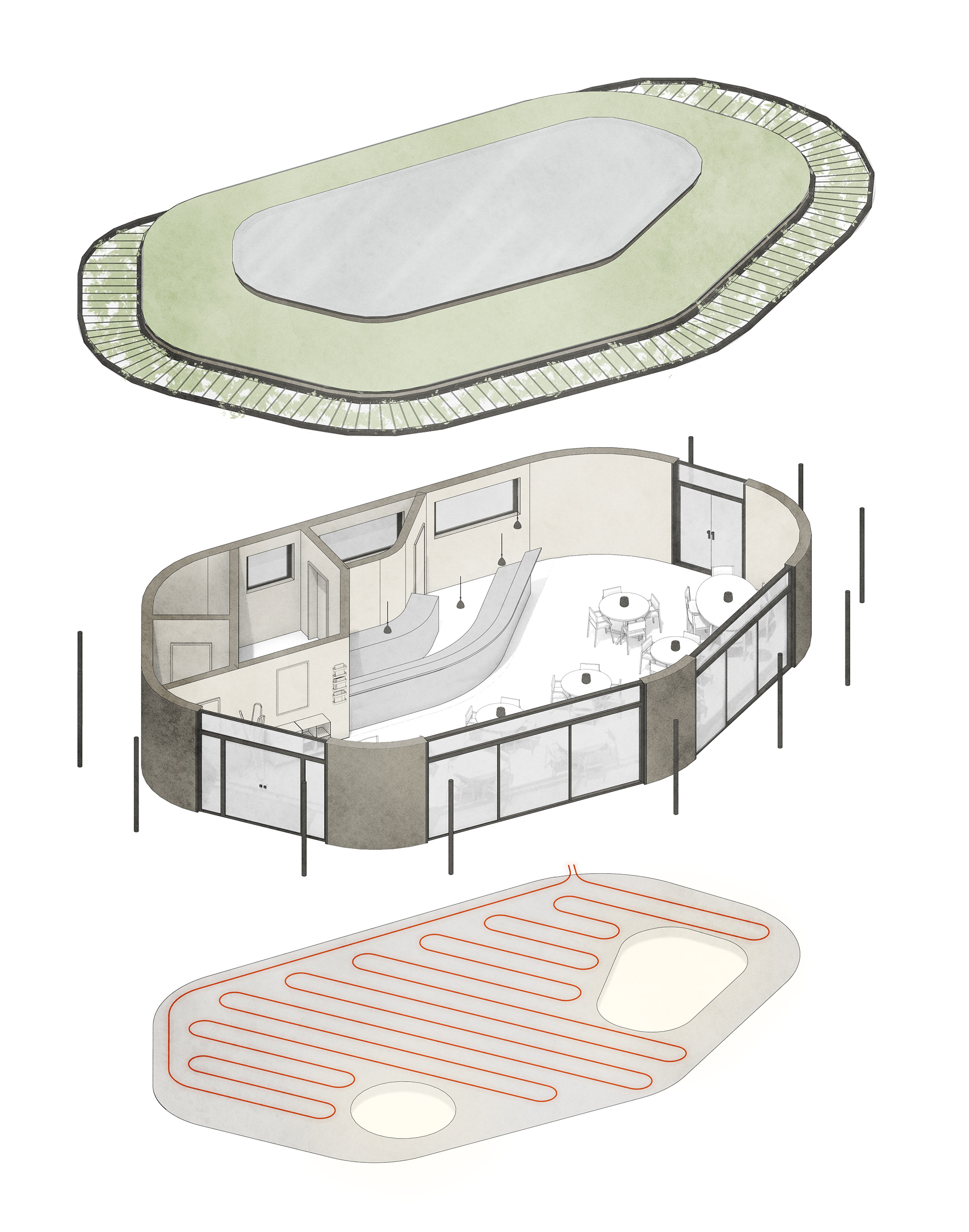 My personal focus was the development of the "Red Thread" concept: a geothermal culture hub that brings together the Roman past with sustainable energy use. Additionally, I contributed the masterplan and the concept diagrams.