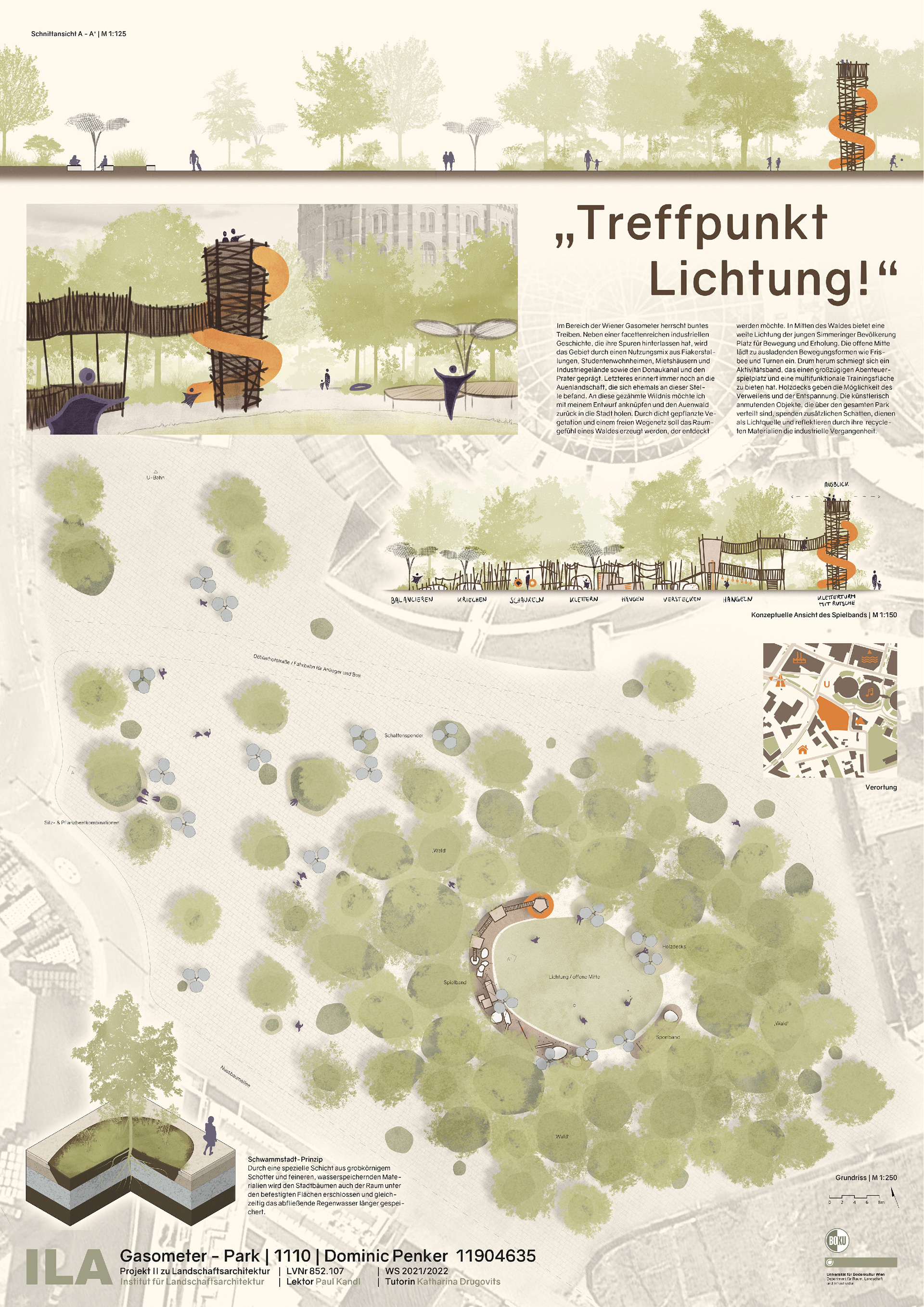 The area around Vienna’s old Gasometers is a blend of industrial artefacts and diverse urban uses. Its history as a former flood plain however is long forgotten. My design seeks to reconnect the site with this floodplain past by reintroducing a dense, forest-like landscape into the city. A network of open paths invites for its exploration and a central clearing provides space for recreation and community activities. An activity band with a playground and training zone surrounds its open core. Wooden decks offer places to rest, while artistic objects crafted from recycled material evoke the site’s industrial past.